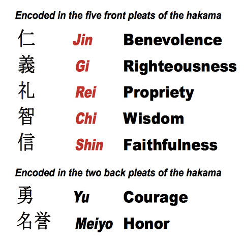 Finally, as a further example of the interconnectedness of Japanese culture, etiquette and budo, the Japanese hakama (pyjama looking baggy black pants) symbolise the Gojo (five qualities) in their pleats. Each pleat represents a different quality of the Gojo as you can see in the figure below.